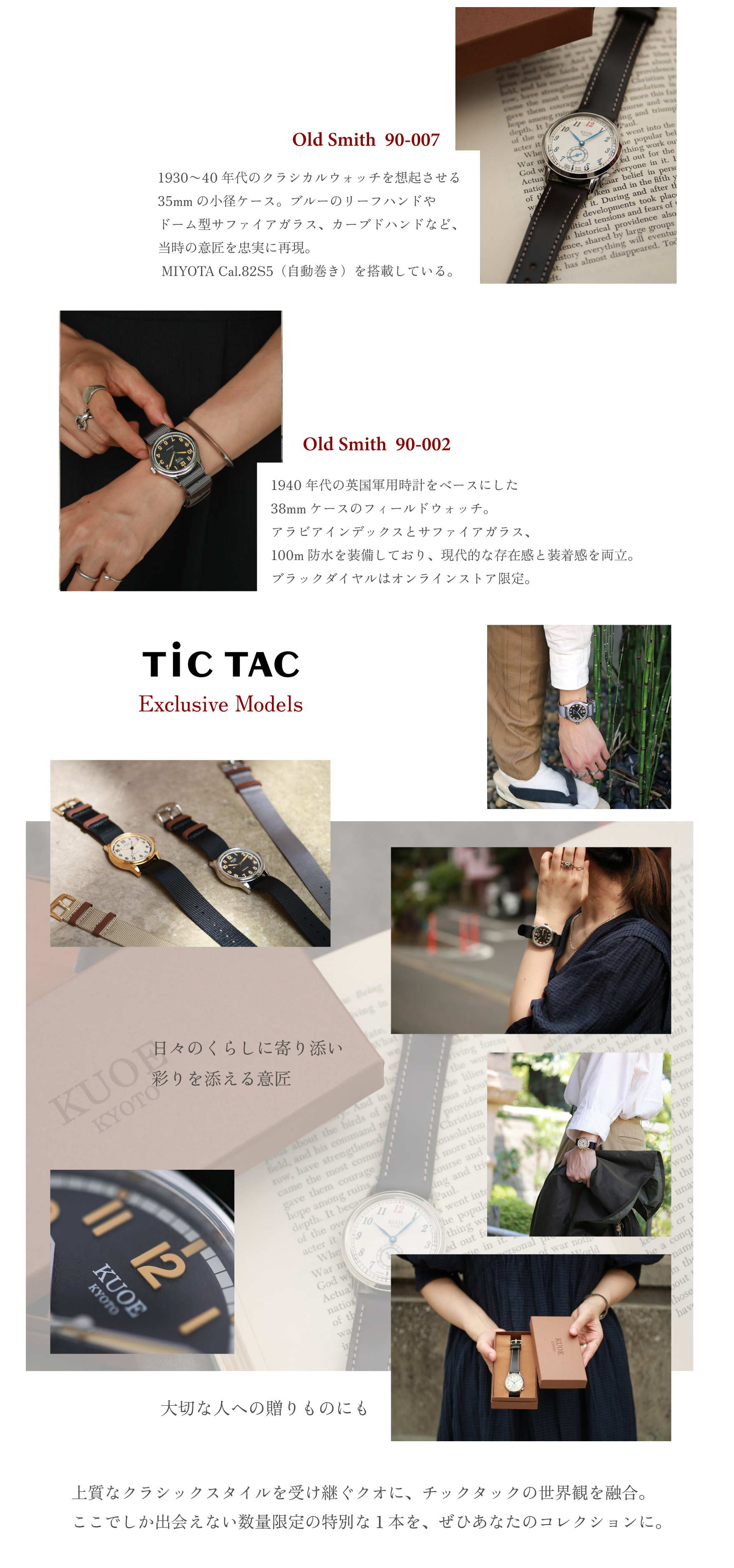 (ゴールド)京都発 KUOE(クオ)5周年を記念した、TiCTAC別注モデル第二弾。他にはないゴールドケースのOLD SMITH。¥60,900(税込)税抜 ¥55,363(ブラック)京都発 KUOE(クオ)5周年を記念した、TiCTACオンラインストア限定モデル。ヴィンテージテイストを象徴するカラーリング。¥58,100(税込)税抜 ¥52,818