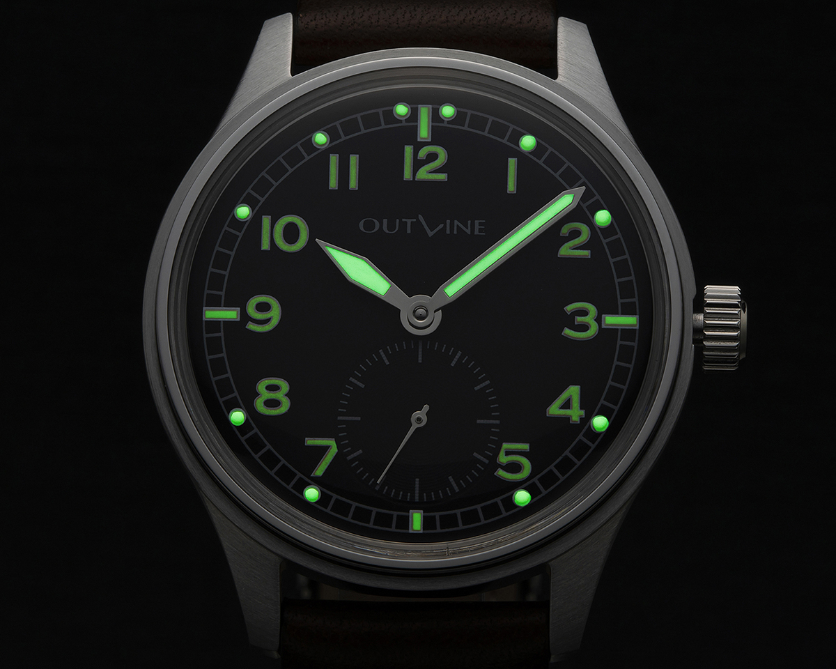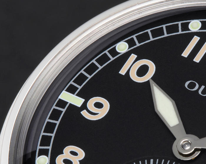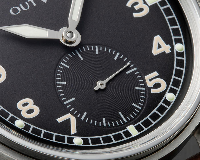 今作では、この究極とも言える当時のミリタリーデザインをより忠実に再現するために、スモールセコンドを6時位置に装備するシーガル社の手巻きムーヴメントをあえて採用。このムーヴメントは秒針もちょうど良い位置にあるため、スモールセコンド全体も当時のように大きくすることができるなど、魅力的なデザインに仕上がっています。