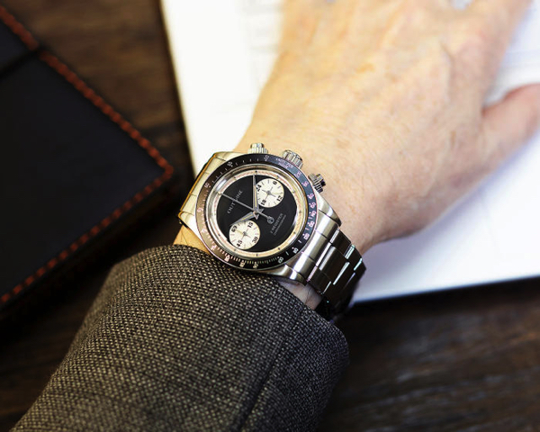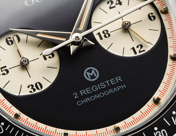 70年代の傑作クロノグラフを二つ目で再現したレトロ調メカクォーツクロノ。