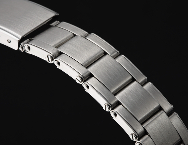 1950年代にロレックスが採用していたリベットブレスを忠実に復刻。リベットの頭に溝がある四つのコマは、マイナスドライバーを使えば自分自身でコマ詰めができる仕組みになっており、これは他のリベットブレスにはないアウトラインだけの仕様です。