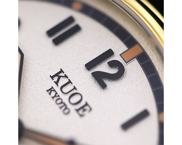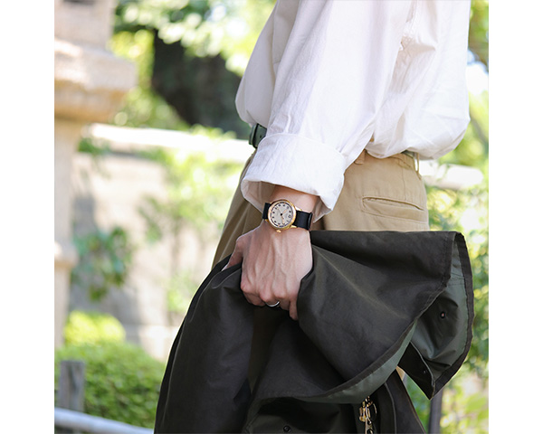 1940-70’sのイギリス軍ミリタリーウォッチにインスパイアされた「OLD SMITH 90-002」シリーズ。既存モデルにはないイエローゴールドのIPケースを作成し、アイボリー文字盤の風合いをより引き立てる、高級感のあるカラーリングを目指しました。