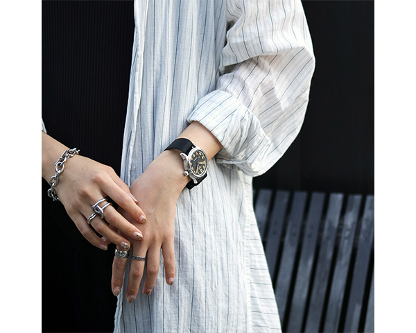 付属のNATOストラップには既存モデルと異なるグレーを採用。シルバーアクセサリーやモノトーンのコーディネートはもちろん、幅広いファッションに合わせられるこだわりの一本。贈りものにも選びやすい王道のカラーリングです。