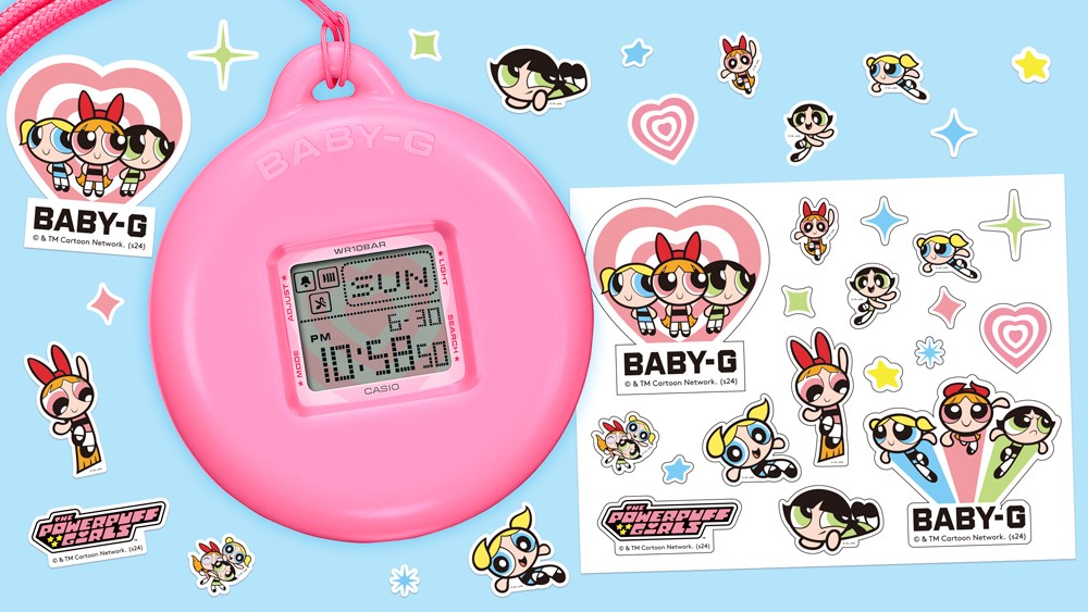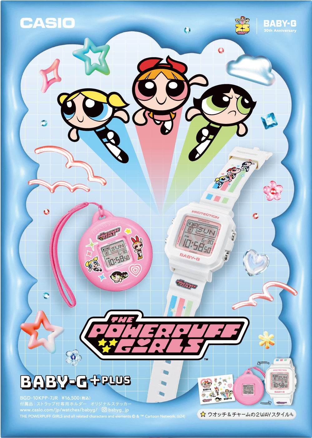 今年で30周年を迎えるBABY-Gと25周年を迎えたタフでキュートな「パワーパフ ガールズ 」とのスペシャルコラボレーションモデルです。ベースモデルには、BABY-G+PLUSシリーズのBGD-10Kを採用。スクエアベゼルのデジタルウオッチとストラップ付専用ホルダーがセットになったモデルで、手首に着けるだけでなく専用ホルダーにセンターケースをセットすれば、ユニークなチャームとしても活躍します。