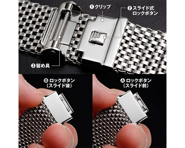 そして12時側ブレス先端にはスライド式ロックボタン(写真②)が付いたクリップ(写真①)。一方の6時側ブレスにはそのクリップを引っかけて手首のサイズに固定するための可動式留め具(写真③)が装備されています。