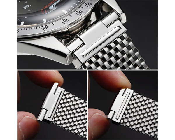 メッシュブレスは6時側と12時側の2枚に分かれており、6時側ブレス先端に付いた引き通しリングに12時側ブレスを通して2重になっている構造。