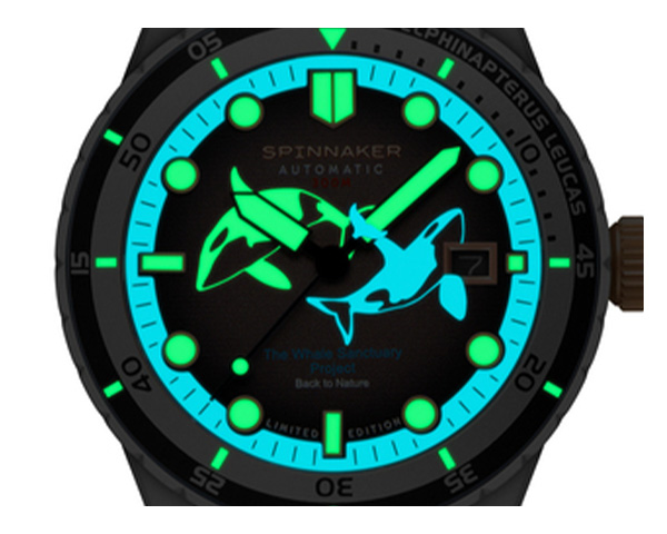 針やインデックス、オルカにはスーパールミノーバが施されていて、暗所でも視認性を確保されているのに加え、2色使いすることにより暗所でもそのデザインを楽しむことが可能となっています。