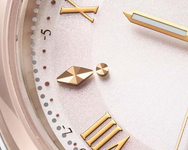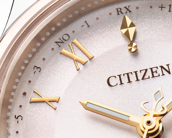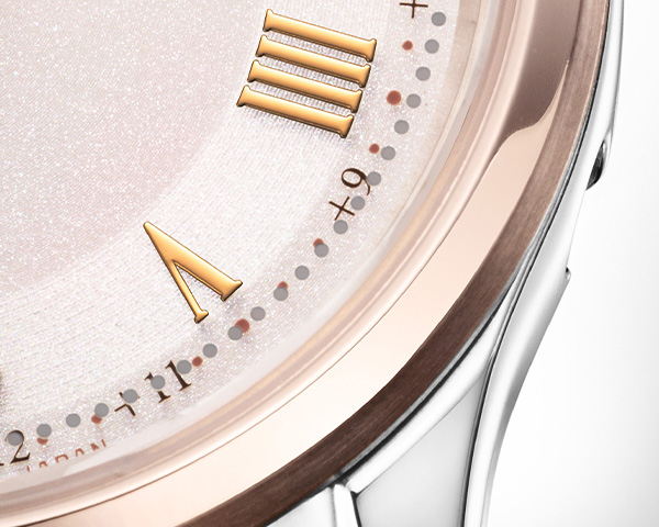 hikariコレクションの特徴である艶やかなベゼルを、すっきり細くアップデート。持ち主の幸せを願い、お守りとなるよう想いを込めた“光の粒”を、ガラスにレーザー加工で表現した「ミルグレインリング」は、クロスシーのデザインの大きな魅力のひとつです。文字板12時、6時、9時位置には、差し込む光をイメージして、ひし形と丸型2種のカットパーツをセッティング。チタンブレスレットモデルは、持ち主ご自身が簡単に長さを調節できるシンプルアジャストを採用しています。