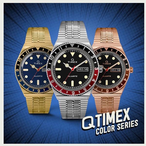 1979年に発売された「タイメックス キュー」の復刻モデルが登場。2019年に先行してアメリカで1000本のみ発売された復刻モデルは、即完売となった話題作です。2色に塗り分けたアルマイト加工の回転ベゼル、自分で電池交換ができるハッチ・ケースバック構造、織り込みのステンレススチールブレスレット、クオーツムーブメントを意味する「Q」をダイアルにあしらうなど、当時のディテールが忠実に再現されています。ベゼルのカラーが映える、ダイバーズルックのデザインです。