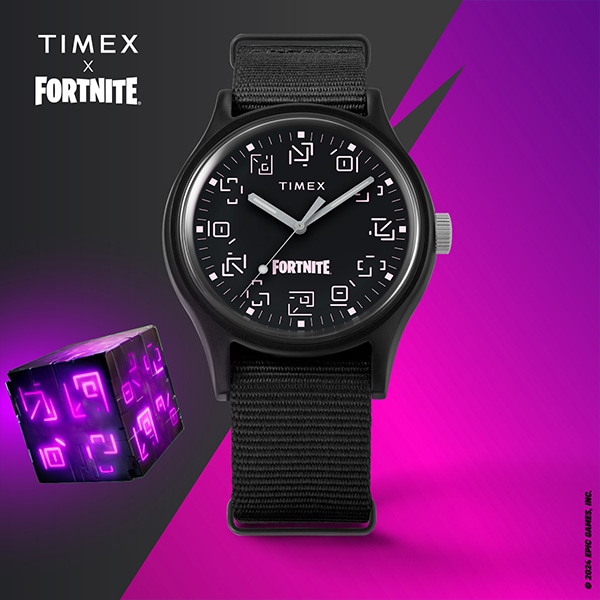 世界で約5億人がプレイする<フォートナイト>。タイメックスとのコラボレーションでは、ゲームだけでなくリアルでもフォートナイトを楽しめるデザインを取り入れています。この<MK1>は元々ミリタリーウォッチをベースにしていますが、伝統のデザインではなく<フォートナイト>のアイコンを大胆に使い、文字盤全面が発光するインディグロナイトライトが点灯するとそれらが浮かび上がる仕掛けが。ケース本体はアルミニウムなので軽量かつメタル感もあり、二層構造のファブリックストラップでいかにもギアっぽい仕上がりです。このウォッチを着けてチームを組んで、アクションに参加し、画面を越えて冒険を広げよう!