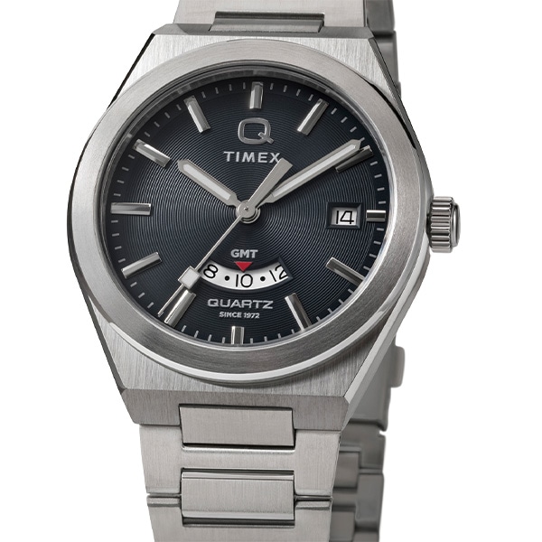 ビンテージの洗練を加えた新たなQ Timexモデルとして登場。デュアルタイム機能を搭載した滑らかなデザインにGMT機能と、Timexならではのスタイルを融合させました。スタイリッシュなケースデザインに、6時位置にある窓からディスク表示のGMTタイム機能を備え、ワールドタイムとして機能します。ブラッシュ&ポリッシュの2タイプの仕上げを組み合わせたケースが光と反射のダイナミックなコントラストを生み出し、ちょっとレトロでありながら今っぽさのあるデザインを取り入れています。