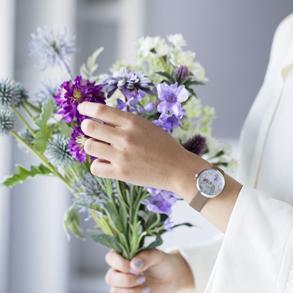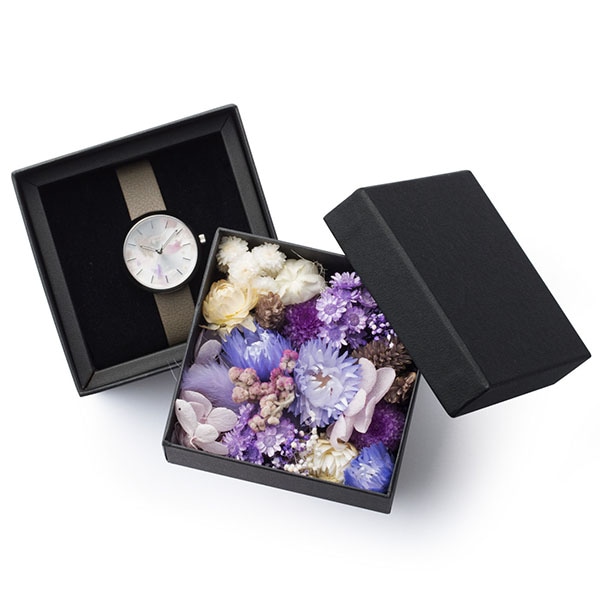 TiCTACオリジナルのレディースブランド「SPICA(スピカ)」から、前田有紀さんプロデュースのフラワーブランド「gui(グイ)」とコラボレーションした腕時計が登場!本物の花びら(プリザーブドフラワー)を手作業により透明な樹脂板に閉じ込め、ひとつひとつ異なる表情を見せるダイヤルが特徴。ストラップには、廃棄予定の有機リンゴの皮をアップサイクルすることで生まれた新素材“アップルスキン”を採用。環境や動物に優しい革新的な新素材で、従来の合成皮革よりも通気性に優れています。またguiによるTiCTACオリジナルのアレンジメントフラワーボックスも付属した特別仕様です。
