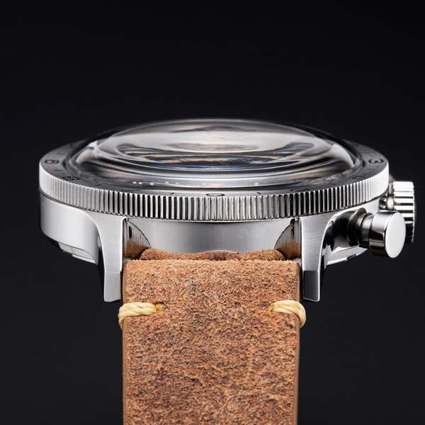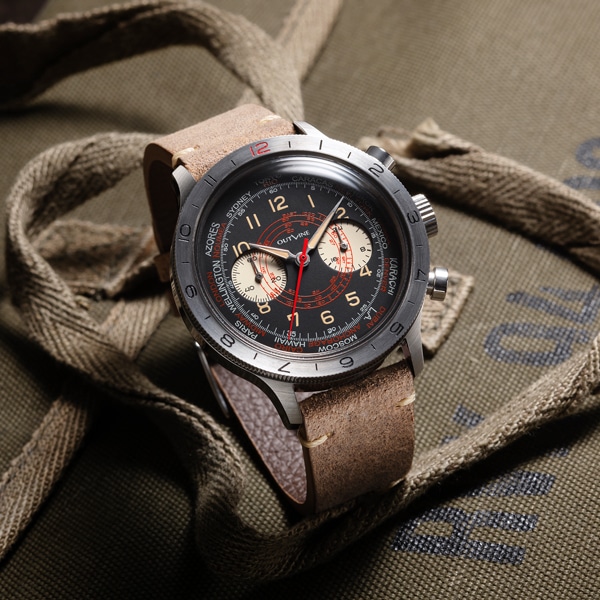 2001年に創刊した高級腕時計の専門誌「パワーウオッチ」の創刊20周年を祝して特別製作したアニバーサリーモデルです。1940年代に空軍士官向けに開発されたと言われ、通称“フライングオフィサー”の呼び名でもよく知られる2カウンタークロノグラフの名機をモチーフに、古典的な雰囲気にこだわった作りました。最大の特徴は、クロノグラフ機構に加えて、文字盤外周に世界23都市の名前が配されており、同時に時差の違う二つの国の時刻を表示できる機能を有している点です。つまり日本の時刻を基本として、文字盤に記載されている23のどれかひとつの都市の時刻を常に確認できるようにしました。ムーヴメントにはセイコーのメカクォーツクロノグラフ、VK64を採用。クロノグラフの計測針については1秒毎に運針するステップ運針ではなく、機械式のクロノグラフムーヴメントのように滑らかな動きのスイープ運針となります。さらに計測停止後にクロノグラフ秒針をゼロリセットする際も、機械式モデルのようにリセットボタンで瞬時に帰針する点は、他社製のメカクォーツにはない魅力です。