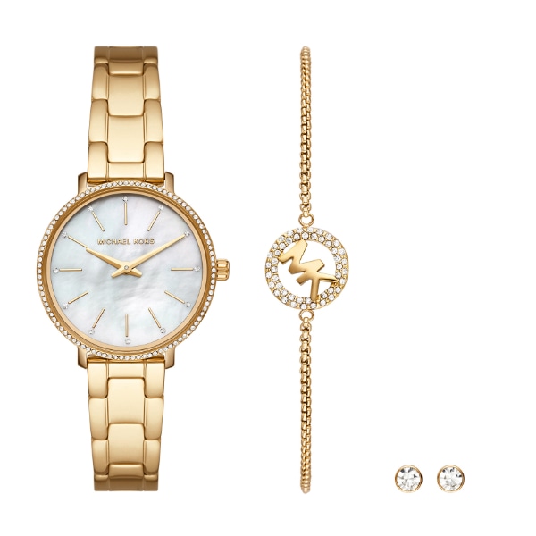 32mm径ケースのPYPER ウォッチに、スチールのパヴェロゴをあしらったスライダーブレスレットとCZスタッドピアスを取り揃えた、華やかなゴールドトーンのセットです。ご自身にはもちろん、大切な方への贈り物にもふさわしい、完璧なペアリングが魅力のギフトです。