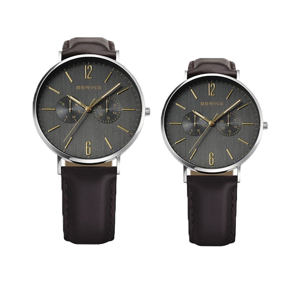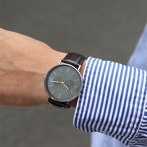 角度や光の加減によって大きく印象を変えるグレーの文字盤は、ラフなカジュアルスタイルも格上げしてくれるので特に大人のカップルに人気です。ダークブラウンのレザーベルトは落ち着いた印象にガラッと変わるので、ビジネススタイルにもぴったりです。