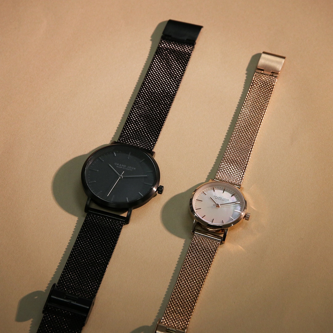【Designed by TiCTAC】メンズ、レディースともに人気No.1のブラックとピンクゴールドのメッシュベルトタイプをぺアセットに。メッシュベルトは丈夫で、毎日着用される方にもおすすめ。