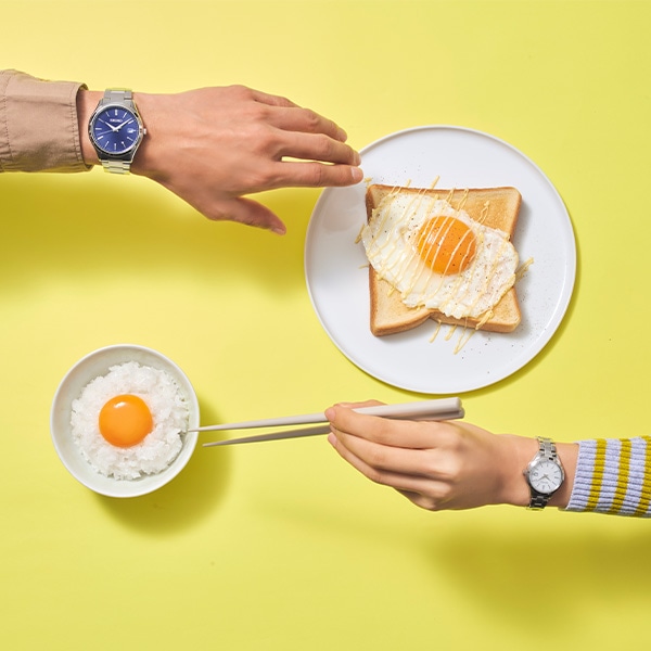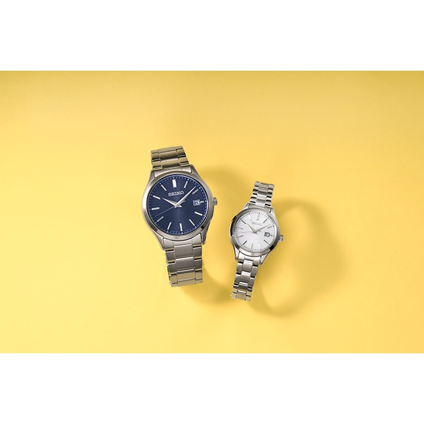 メンズ、レディースともに定番カラーのぺアセット。お仕事向けと思われがちなセイコーセレクションのベーシックラインですが、普段のお洋服にも合わせやすく、オンオフ問わずずっと着用できるのがペアウォッチとしてうれしいところ。
