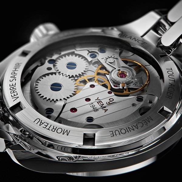 サファイアクリスタル製のエキジビションケースバックからセリタ社のSW210-1bのムーヴメントの動きを眺めることが可能。精巧さを極めたデザインの実現のために提案されたもので、ブルー・スクリューとジュネーヴ・ストライプで装飾されている。精度と信頼性の高さで知られているスイス製キャリバーは時間、分、秒の機能を持ち、機械式巻き上げ機構は日差±7秒の精度を提供。