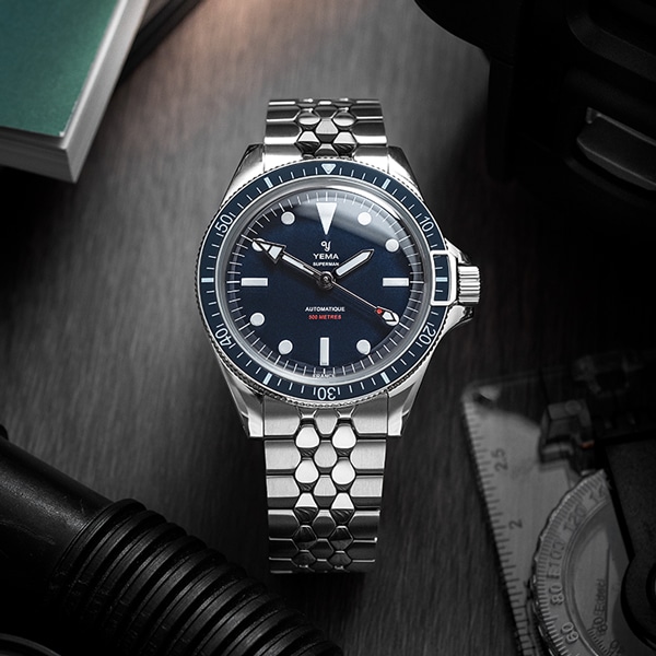 自社製キャリバー YEMA2000を搭載したスーパーマン500は、その象徴的なデザインを維持しながら、技術的な改良と近代化された構造の恩恵を受けています。ベゼルの12時位置にある発光マーカーと矢印型の発光分針は深海における劣悪な視認環境においてもダイバーに正確な潜水時間を提供いたします。