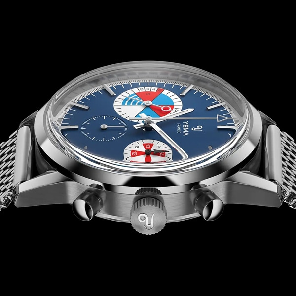 「ヨッティングラフ」は、ヨットレースなどのレガッタのために作られたイエマを代表するクラシックモデルです。1968年に誕生したこのモデルは、70年代にコレクションの一部となり趣味を楽しむための製品を求める世代に対して、スポーティーなフランス製時計として展開されました。70年代のクラシックな雰囲気と爽やかな配色のトリコンパックスが印象的なYEMAのヨッティングラフ メカクォーツモデル