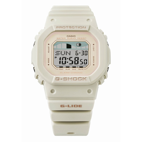 タイドグラフ機能付きスポーツラインG-LIDEの小型、薄型化したモデルです。再生可能な有機資源を原料としたバイオマスプラスチックをベゼルとバンドに採用し、環境への負荷低減に配慮しました。機能面ではサーファー必須の機能であるタイドグラフとムーンデータも備え、世界中の海でのライディングをサポートします。サーフシーンにおいて人気のノスタルジックなカラーで揃えた、ファッショナブルでスポーティなモデルです。