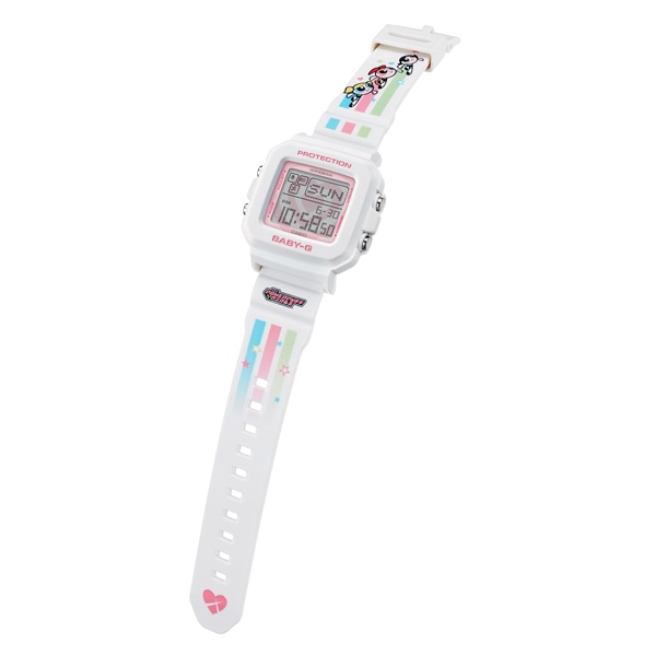 今年で30周年を迎えるBABY-Gと25周年を迎えたタフでキュートな「パワーパフ ガールズ 」とのスペシャルコラボレーションモデルです。ベースモデルには、BABY-G+PLUSシリーズのBGD-10Kを採用。スクエアベゼルのデジタルウオッチとストラップ付専用ホルダーがセットになったモデルで、手首に着けるだけでなく専用ホルダーにセンターケースをセットすれば、ユニークなチャームとしても活躍します。