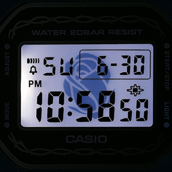 LEDバックライト点灯時、液晶にそれぞれのカラーのバラが浮かび上がり、大切な瞬間に時計に込められた意味を思い出すことができます。裏蓋には茨のモチーフをデザインしタフなコンセプトを表現しました。困難な状況でも力強く咲き続けるバラをコンセプトにした、大切な人に贈るホリデーシーズンのギフトにぴったりのウオッチです。