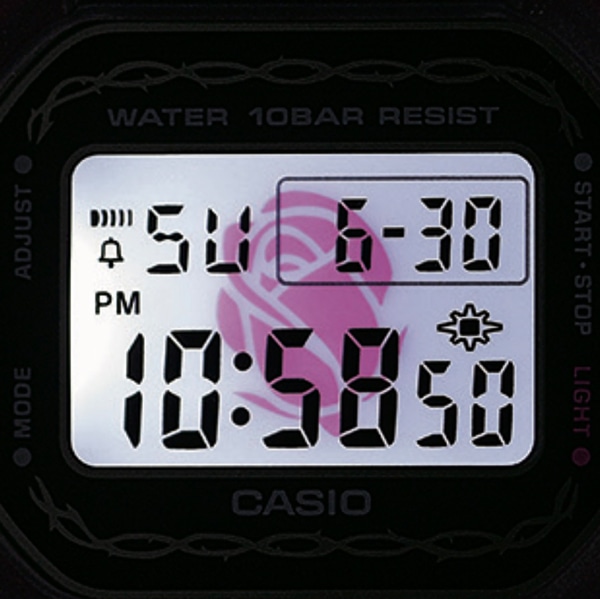 LEDバックライト点灯時、液晶にそれぞれのカラーのバラが浮かび上がり、大切な瞬間に時計に込められた意味を思い出すことができます。裏蓋には茨のモチーフをデザインしタフなコンセプトを表現しました。困難な状況でも力強く咲き続けるバラをコンセプトにした、大切な人に贈るホリデーシーズンのギフトにぴったりのウオッチです。
