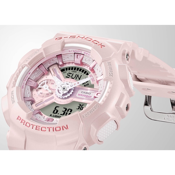 ベゼルとバンドに偏光パール塗装と光沢を抑えたマット仕上げを施し、優しく上品なシルクの質感を表現しました。見る角度で表情を変え、腕元を美しく彩ります。カラーバリエーションはソフトなイメージの3色。コーディネートしやすいホワイトに加え、新色のブルーとピンクをラインアップしました。