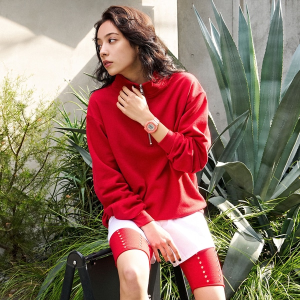 角型フォルムに差し色を組み合わせたカラーブロックデザインとスポーツウェアと相性のよいファブリックパターンを採用しスポーティな印象に。ボタンにもアクセントとなる差し色を施しています。ガラスにはメタリック印刷を施し、質感も高めています。コンパクトなサイズで腕の細い方でも快適に着用できます。