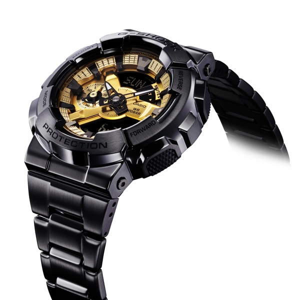 緻密な鍛造工程を経て、切断と研磨だけでなく、特殊な成形による金属製ベゼルを採用し、タフな構造はそのままに無骨で存在感のあるデザインに仕上げました。ケース素材には、高剛性を発揮するカーボン繊維入りファインレジンを使用し、新たにデザインされたメタルバンドで、幅広いストリートシーンにも対応できる仕様になっています。ブラックIP塗装でオールブラックにゴールドのダイアルが輝くGM-110BD-1A9と、シルバーステンレスにガンメタリックのダイアルでシーンを選ばないGM-110D-8Aの2モデルをラインアップ。G-SHOCKビッグケースの存在感と、デザイン、フォルム、サイズ、さらに耐衝撃性能に徹底的にこだわった、GM-110です。