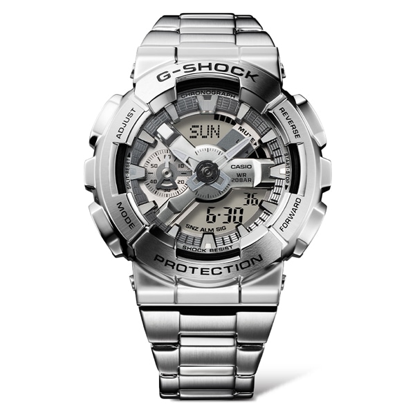 1983年の発売以来、究極の強さを求めて進化を続けるタフネスウオッチG-SHOCK。そのアイコニックなスタイルで人気モデルのひとつであるビッグケースのアナログ・デジタルコンビネーション、「110シリーズ」のベゼルとバンドを金属素材にアップデートしたGM-110です。