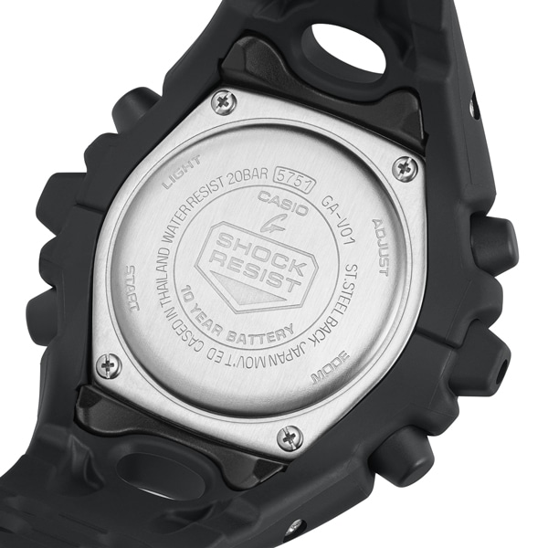 エッジの効いたパーツを組み合わせた有機的な外装フォルム、2つの穴が大きな特徴となっている新開発のショックリリース針など、今までの常識を覆す斬新な発想で、強さを求めて挑戦を続けるG-SHOCKのアイデンティティを形にしました。モジュールを保護するセンターケースを、ベゼル・バンド一体構造の外装パーツでカバー。大型の立体インデックスをガラス上面に配置することで、衝撃を緩和するバンパーの役割を持たせました。G-SHOCK独自の耐衝撃性能をキープしながら、ユニークかつ力強い外装デザインを実現しています。衝撃の影響を受けやすい針をシャフトに固定せず、磁石の力で取り付けるマグネティックホールディング構造を開発しました。この構造で取り付けたショックリリース針(分針)は、磁力で固定されているため、受けた衝撃を受け流すことができます。本構造を採用することで、針の大型化やデザインの自由度を上げることが可能になりました。