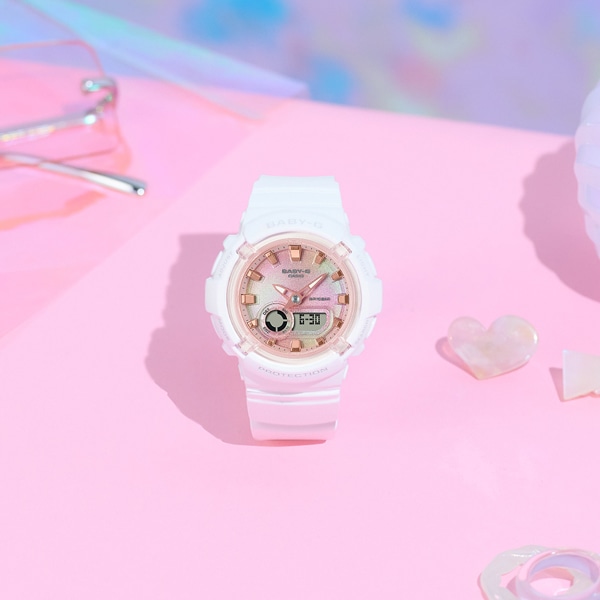 丸みのあるシルエットと多層構造ケースが特徴のBGA2をベースに、パステルブルー、ホワイトの2色をご用意。柔らかなタイダイ柄と蒸着仕上げのインデックスで手元を華やかに演出します。耐衝撃構造や10気圧防水機能など、日常のアクティブシーンに欠かせない頼れる機能も充実。スタイリッシュで実用性抜群のウオッチが、あなたの日常に輝きをプラスします。