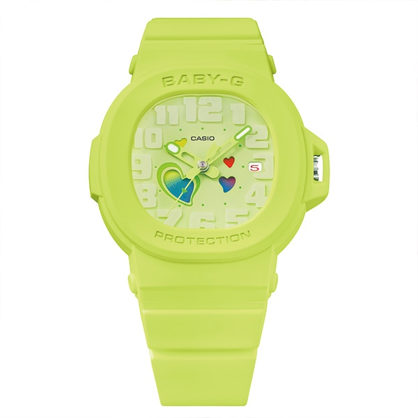 アクティブな女性に向けた耐衝撃・カジュアルウオッチBABY-Gから、文字板にあしらったハートモチーフが日替わりでカラーチェンジするアナログウオッチです。