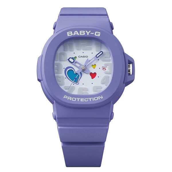 アクティブな女性に向けた耐衝撃・カジュアルウオッチBABY-Gから、文字板にあしらったハートモチーフが日替わりでカラーチェンジするアナログウオッチです。