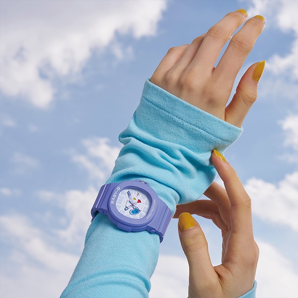 大小4つのハート型の窓から、文字板下層に配したカラーディスクの色が見え隠れ。カラフルな日付表示とともに日替わりで色が変わる、遊び心のあるフェイスに仕上げました。また、丸みを帯びた立体形状のアラビアインデックスをレイアウトし、時刻が見やすい仕様になっています。さらに、ハートを射貫くキューピッドアローをイメージした秒針を採用。 アナログウオッチをBABY-Gらしくアレンジした、キュートなフェイスデザインです。