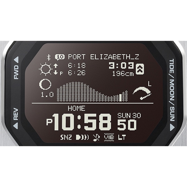 バンドの主な樹脂パーツに、環境負荷低減への貢献が期待されるバイオマスプラスチックを使用しています。スマートフォンリンクを搭載し、専用のアプリケーションを介して、潮汐情報や日の出/日の入時刻を世界約3300カ所から選択できます。また、ワイドフェイスで高精細な液晶を採用。タイドグラフ、ムーンデータ表示に加え、満潮/干潮時刻、満潮/干潮の潮位、日の出/日の入時刻が表示可能です。トレーニング計測機能と合わせて、世界を飛び回りタフに戦い抜くサーファーを腕元からサポートします。ベゼルは樹脂とメタルを組み合わせて構成し、耐衝撃性能を備えました。バンドには、フィット性と水、汗逃げを考慮したスリットが入ったバイオマスプラスチックのソフトウレタンを採用し、着け心地を追求しました。