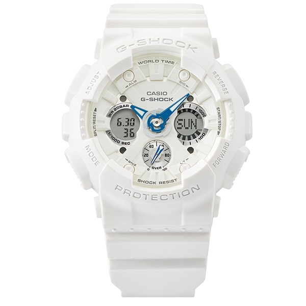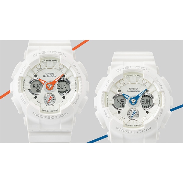 立体パーツで凹凸感を強調したユニークな文字板を、爽やかなホワイトのワントーン仕上げに。針にもホワイト蓄光を施しました。オレンジやブルーのアクセントカラーが、夏らしい開放感を演出します。
