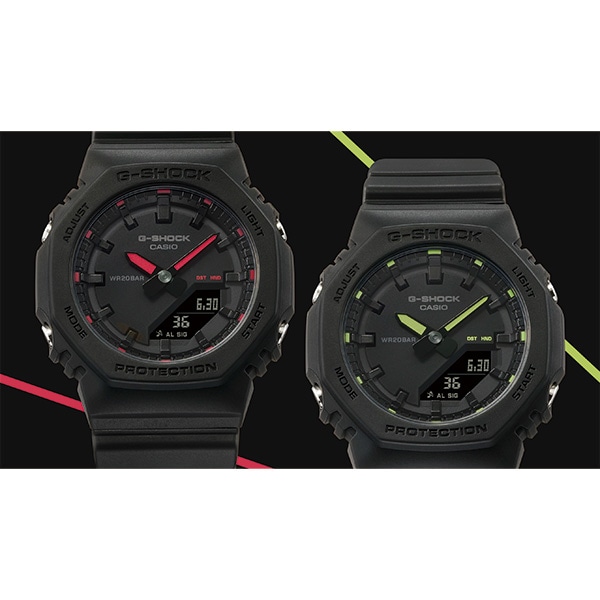 カラー針とミニッツマーカーの差し色に、ライトイエローやビビッドピンクを採用。針の蓄光カラーにも同系色をあしらいました。オールブラックを纏った八角形フォルムのシンプルデザインを、ビビッドな個性で彩ります。