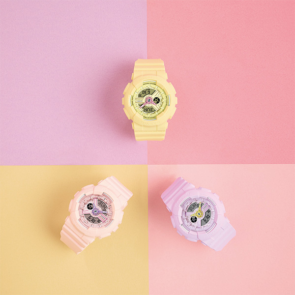 ベースモデルには、文字板やインデックスなど様々なパーツを複雑に組み合わせたデザインが特徴のBA-110を採用。柔らかなパステル調のカラーを纏ったモデルに、針の色には鮮やかなポップカラーの差し色を施しました。遊び心あるカラーコントラストが気分を明るく盛り上げます。耐衝撃構造や10気圧防水機能など、日常のアクティブシーンに欠かせない頼れる機能も充実。日常生活はもちろん、スポーツやレジャーシーンも安心。アクティブな毎日を応援します。