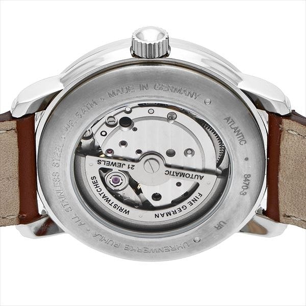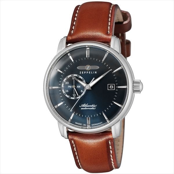 2021年3月に日本デビューしたアトランティックコレクションより、大西洋の深い海の色をイメージしたネイビーダイヤルが登場。深みのあるネイビーダイヤルを絶妙に引き立たせるブラウンカーフのベルトは、若干のヴィンテージ加工を施すことによって、90年前の優雅な旅のイメージを表現しています。バーインデックスは飛行船ラウンジの窓枠から着想を得たデザインで、緻密に計算された立体的かつシェイプされた設計です。裏蓋はシースルーバック仕様で、ローターやムーブメントの動きを楽しむことができます。