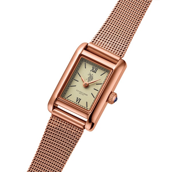 華奢なストレートラインのレクタングルケースに、オニキスのリュウズがモダンなアクセントを添える。12時6時位置にはスマートなローマンインデックスが際立つダイヤル、クラシックモダンを表現したデザインをまとめます。 文字盤にはPOLOロゴをあしらい、ブランドらしさも忘れず上品なデザインの中でさりげないアクセントに。 カジュアルにはもちろん、オフィスやフォーマルなスタイルにも活躍してくれるデザインです