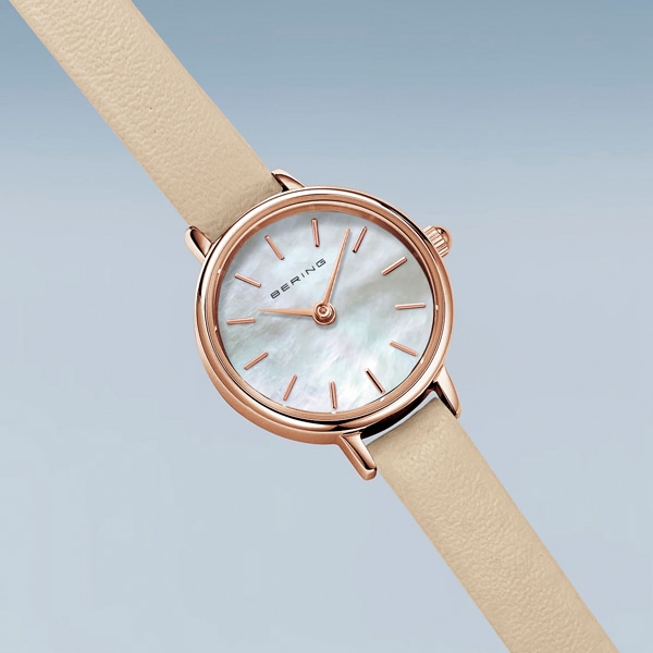デンマークデザインらしいミニマルでクリーンな印象をもつクラシックコレクション。BERINGの中でも特に小さな22mmのケースに、幅6mmの細く繊細なストラップを組み合わせました。見る角度で表情を変えるパールのダイヤルを採用した3色は日本国内だけの限定カラーです。フラットで反射の少ないサファイアガラスを採用しながら1万円台で手に入る価格も魅力的です。
