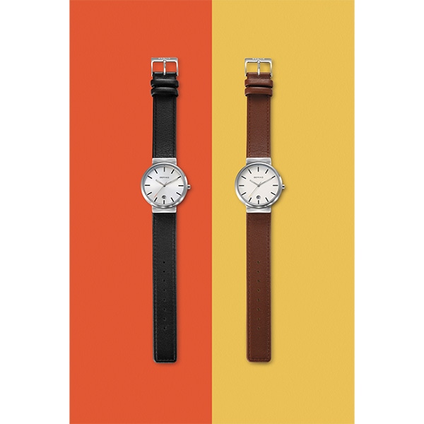 シンプルで実用的で、どこか温かみのあるデザイン。綺麗なカーブを描いたラウンド型のケースとステッチワークが入ったレザーストラップ。薄い凹みをもたせたインデックスに先端に色の入った秒針。3針の日付表示があるオーソドックスな時計ですが、北欧の家具の様にどこかほっとできるような優しいデザインの時計です。