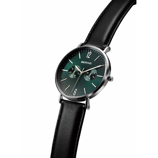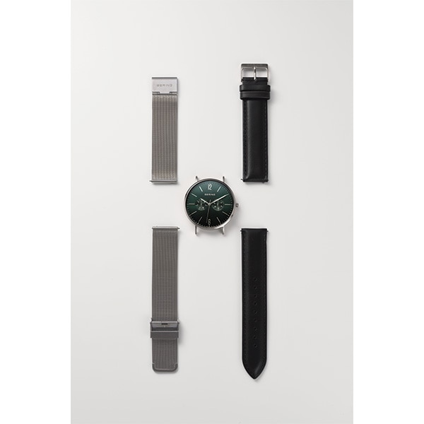 BERINGのコレクションの中でも定番で最も人気のあるシリーズ「Changes(チェンジズ)」。チェンジズはストラップが2本付属しており、コーディネートやシーンによってストラップを簡単操作で付け替えて着用することが出来ます。本モデルは、ブラックレザー×シルバーメッシュの2本が付属します。今回、このシリーズに新色ディープグリーンが加わります。2025のトレンドカラーでもあるグリーンですが、BERINGは普段使いしやすく、素材の上質さが伝わるような深いグリーンをダイヤルに採用しました。ブラックに近い深めのグリーンは、カジュアルな装いの差し色としても、スーツやジャケットを羽織るビジネスシーンでも着用して頂けます。