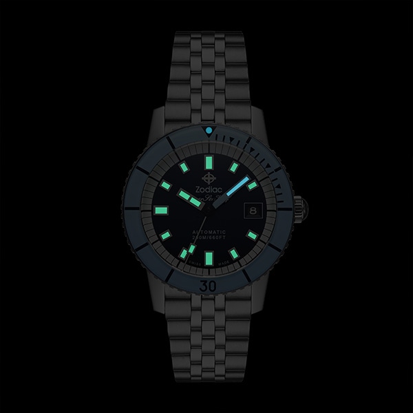 深海の鮮やかな色合いをモチーフにしたSUPER SEA WOLF 53 COMPRESSION。ベゼルとマットダイヤルの大胆なブルートーンが、広い海の美しさを表現しています。5リンクブレスレットをあしらったクラシックな艶消しステンレススチールケースには、Zodiacを象徴するスイス製STP 3-13オートマティックムーブメントを搭載しています。