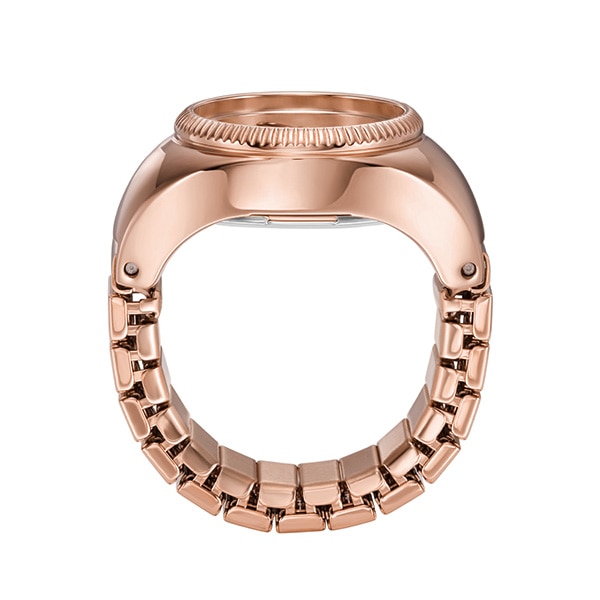 この 15 mm ウォッチ リングは、ローズ ゴールド トーンのサンレイ ダイヤル、2 針ムーブメント、ローズ ゴールド トーンのステンレス スチール バンドが特徴です。