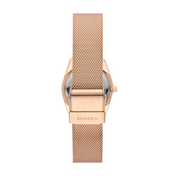 再生ステンレススチールを50%以上使用した26mm径ケースにソーラームーブメントを搭載したGRENEN LILLE。ホワイトのマットダイヤルに、再生ステンレススチールを50%以上使用したローズゴールドトーンのメッシュブレスレットを組み合わせました。ウォッチストラップは付け替えできません。