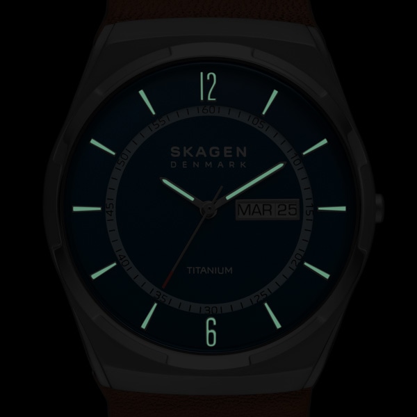 40mm径のケースにデイデイト表示付き三針ムーブメントを搭載したMELBYE TITANIUM。