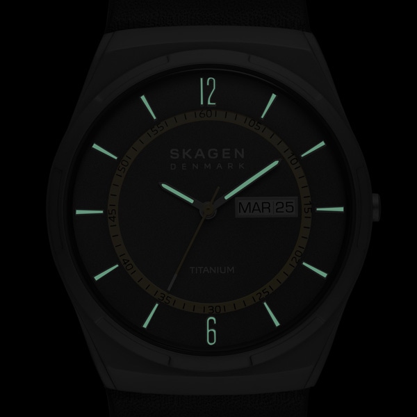 40mm径のケースにデイデイト表示付き三針ムーブメントを搭載したMELBYE TITANIUM。